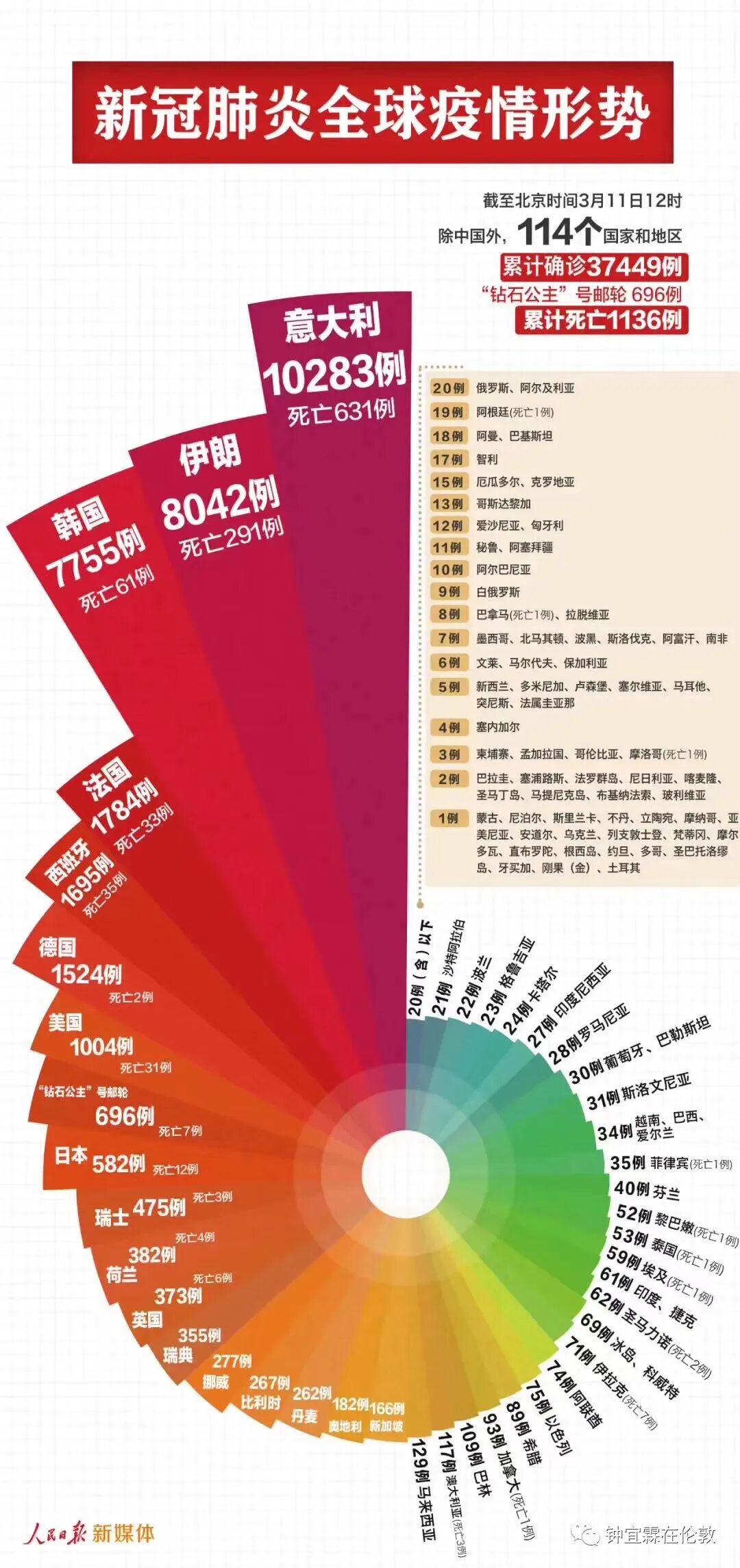 截止2020年3月6日伦敦时间上午11点,全世界各国的新冠肺炎感染数字如图所示: