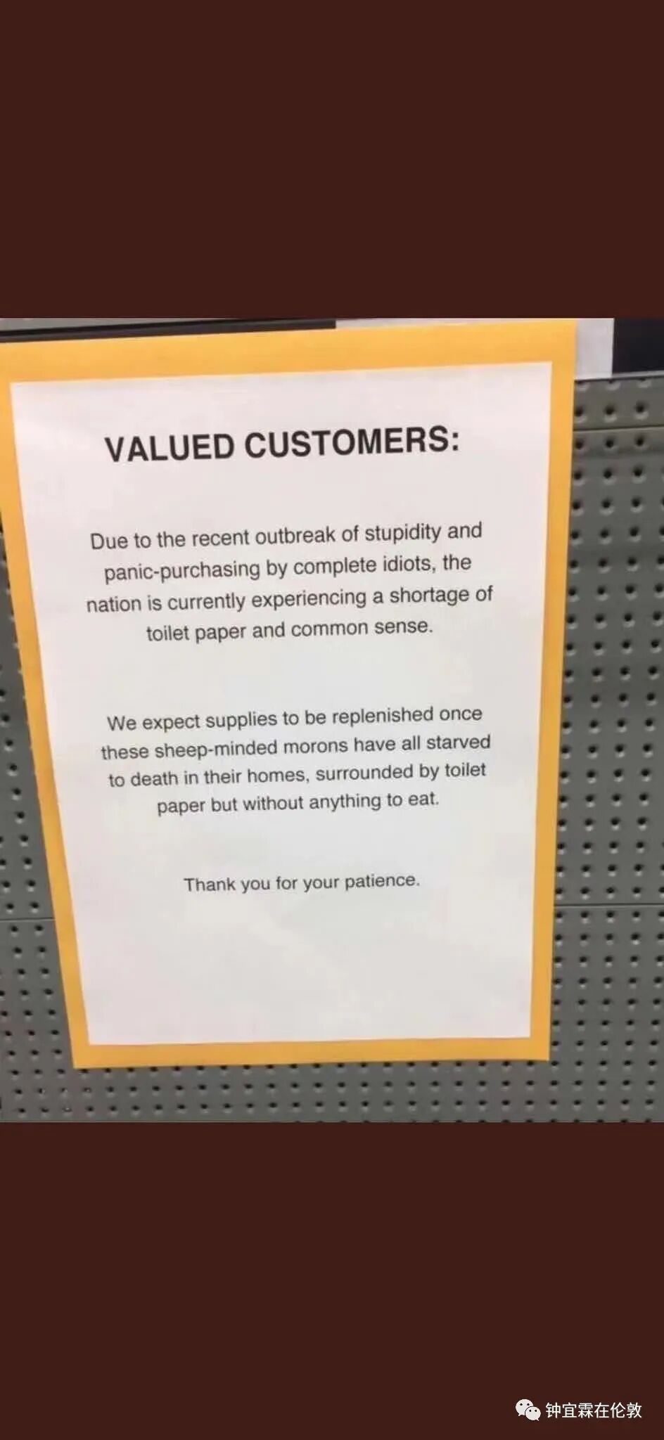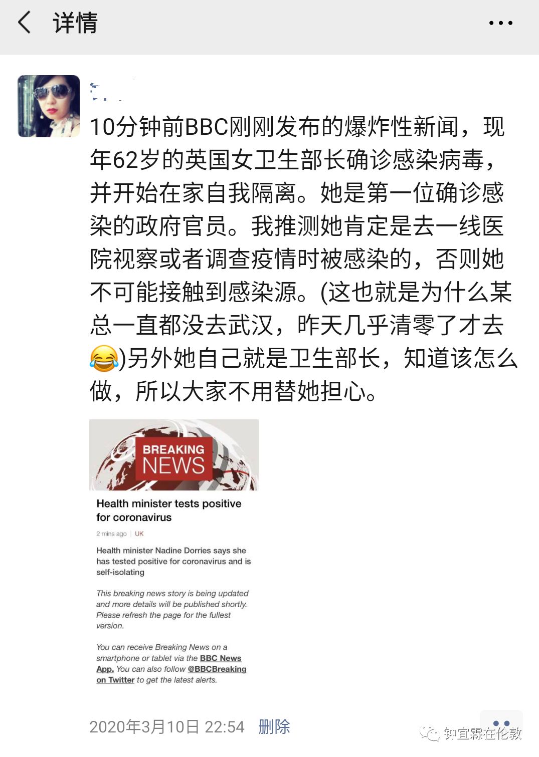 我还告诉楼上图里的这个傻X,老娘几年都没回国了,说白了就是怕回国吃饭吃一肚子的抗生素。现在中国官方数字确诊8万人,我更是几年之内都不可能回国的了。大家都知道新冠病毒特别聪明,可以通过粪口传播,所以以国内的卫生条件和消毒条件,我都不知道那些病毒通过下水道和粪便以及空气中的气溶胶会存在多久,还是以后会和肺结核杆菌一样,存在在40%的中国人的肺里。所以多谢这个神经病的关心,我可以明确地告诉你,老娘我一直住在伦敦,几年内也不可能再吃饱了撑的回中国去冒被病毒残留感染的险。另外张文宏医生说“防火防盗防同事”就是爱国,我说“防火防盗防同学”就成了不爱国,这些没脑子的猪真是蠢得让我完全无法与之对话,因为他们已经蠢得不能再被算作是人类。