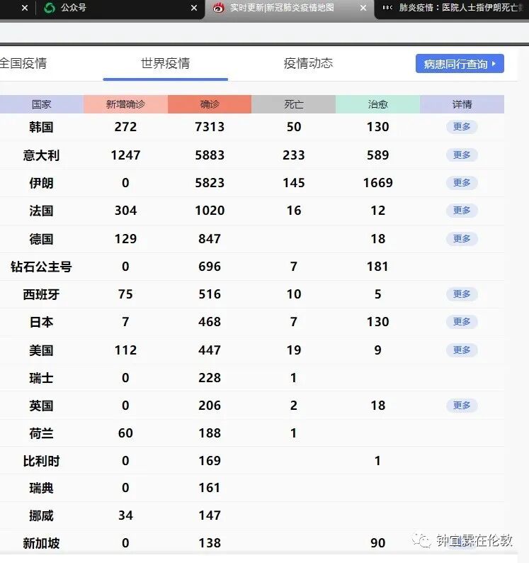 如果你觉得最危险的是感染数字最多的韩国,那就错了。在我看这张图表的时候,我第一反应就是现在最危险的国家不是韩国,而是伊朗。你们可以看一下伊朗的那一排数字,累计确诊4747例,昨天新增1234例。但这都不是最可怕的,最可怕的是这后面的两个数据:累计死亡124例,治愈739例。