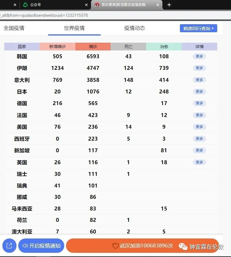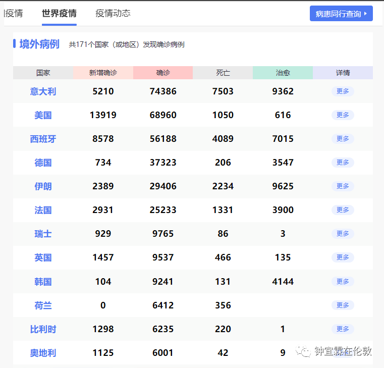 除了感染最严重的日本(1076例)和韩国(6593例),在亚洲以外的国家中,美国总确诊数是236例,欧洲国家里,德国累计565例,法国423例,西班牙223例,英国还算比较少的,目前只有116例。待会我再来说英国的问题,现在让我们先看这张数字统计表,你们觉得现在最危险的国家是哪里?