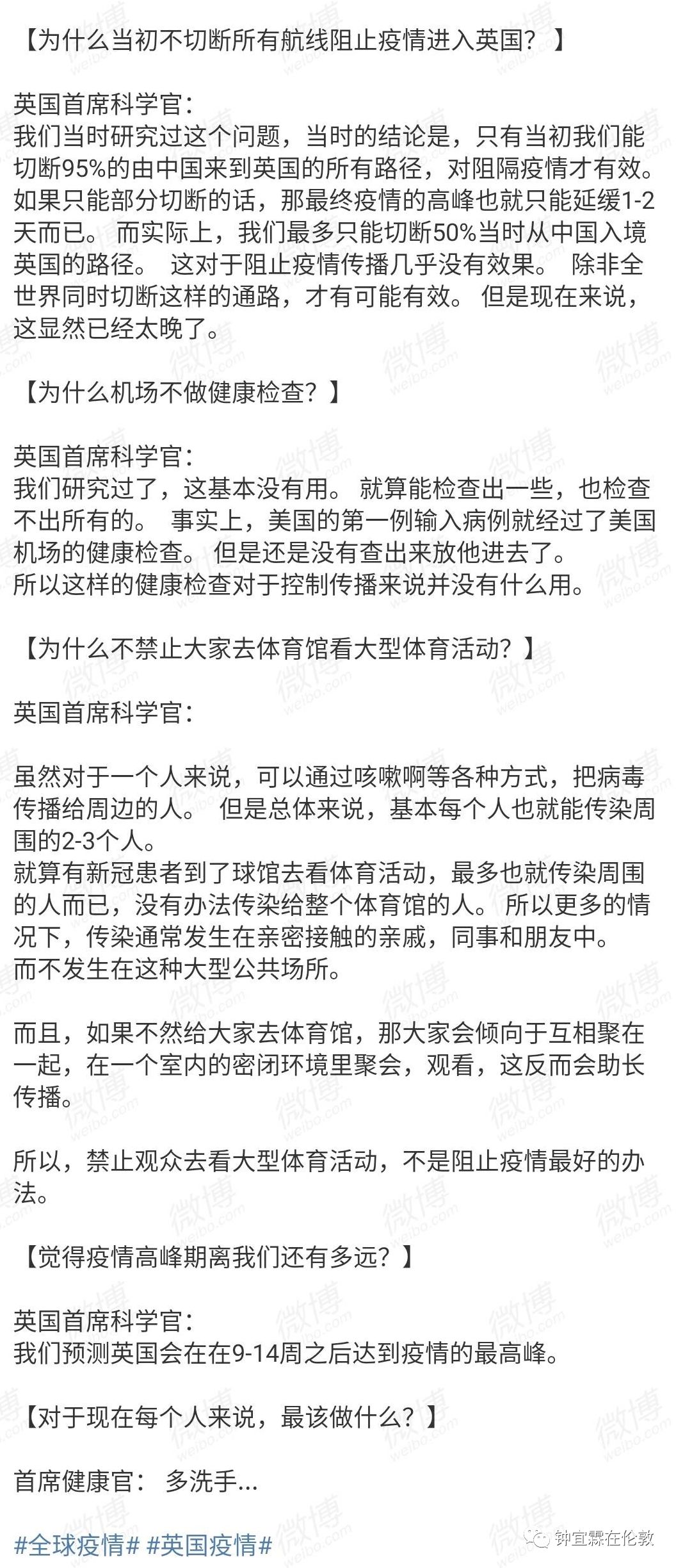 另外以下对话的时间是在十天前的3月15日,当时英国的群体免疫不被国人所理解,现在全世界美法德英等众多国家都已经接受和赞同了这个理论和防疫的策略,并且世界各国都开始根据这个思路,开始尽量拉平各国的感染曲线,以保证医疗资源的充足和拖延民众被感染的时间。所以说,时间是检验真理的唯一标准。不听科学言,吃亏在眼前。截至今天,2020年3月26日伦敦时间中午12点,全世界除中国外已经有398284人确诊感染,加上中国的8万人,总共已有48万人感染,并且这个数字每天都在以几何级数大幅攀升。眼前的现实像灾难片一般恐怖。所以正如有媒体所说的,60%的群体免疫已经不是科学的预测,而是即将成为正在发生的现实。