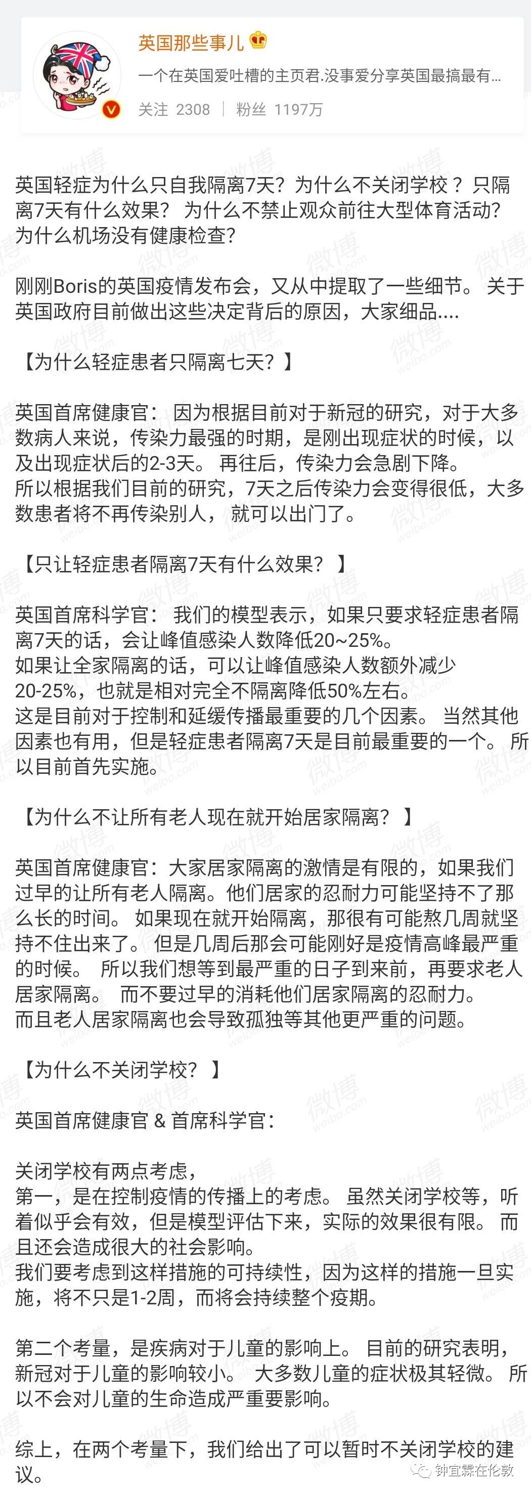 而且就算他下这种命令,没有任何一个英国人会听。就是这么简单。还有那个科学官当时接受记者采访的时候,他还说了一个很好玩儿的,当时记者就问他说,那为什么不暂时关闭学校的。然后这个科学馆就说,他说我们也都评估过排练过,如果关闭学校以后会对应的控制会怎么样?然后我们发现了这个控制的很小。因为你就算关闭了学校,接小孩儿去哪儿?对吧,那么这些小孩儿的,一般来说就会有这个老人照顾了,因为爸爸妈妈都有工作,所以可能就给爷爷奶奶照顾了。那爷爷奶奶又是免疫力最差。最容易被这个病毒杀死的人群。所以你反而是把危险带给了老人,这是第一,他说,第二,你如果不让小孩儿出去跟其他的小孩儿玩儿。让他小孩儿呆在家里就呆在家里。他说,我们都知道,你能管得住这孩子吗?根本管不住。让他不一个月不跟其他小朋友玩儿,你根本管不住,记住英国不是中国小孩儿,英国小孩做不到的,不可能的。