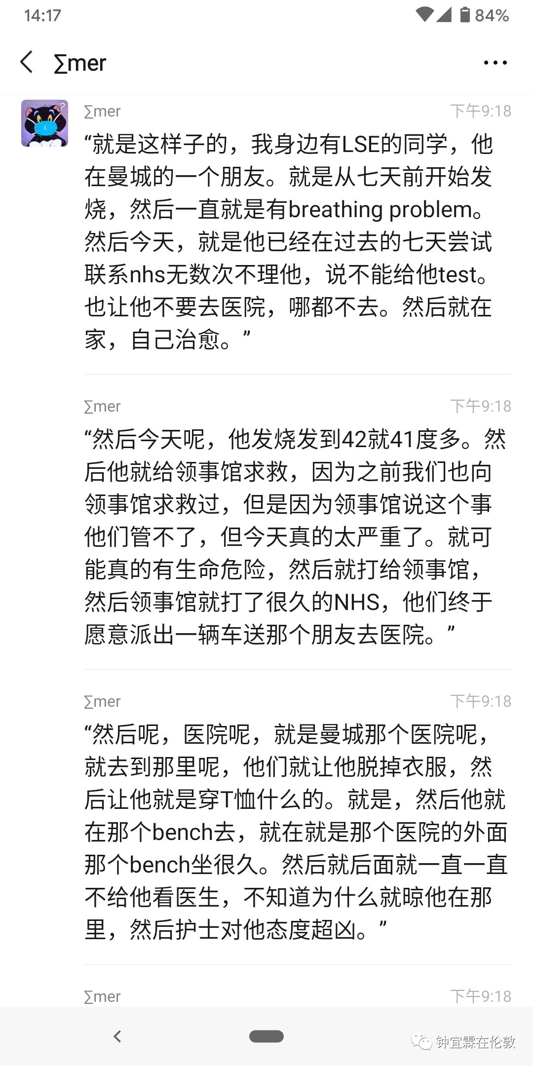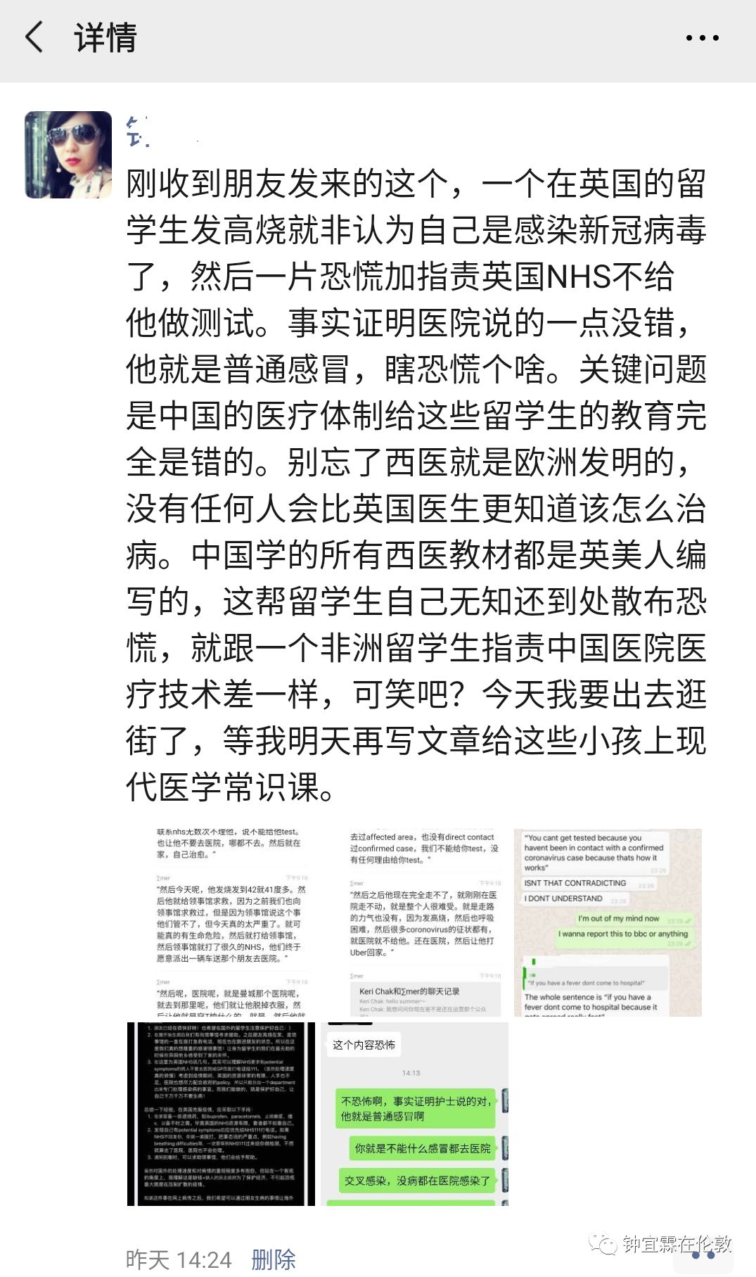 上面我还只说了这个感冒的留学生不该自己不听111的话,自行找大使馆跑到医院去的第一点,还没往下继续捋,后面他因为无知犯的各种错误。比如人家医院的护士告诉他,他根本不应该违反规定到医院里来,他还觉得很委屈,觉得被人家歧视了。又比如医生让他脱掉大衣穿个T恤衫坐到医院外面的凳子上,本来是完全符合医学常识的物理降温和避免在医院里感染其他人,却被他当作是虐待他,大冬天的让他穿那么少
