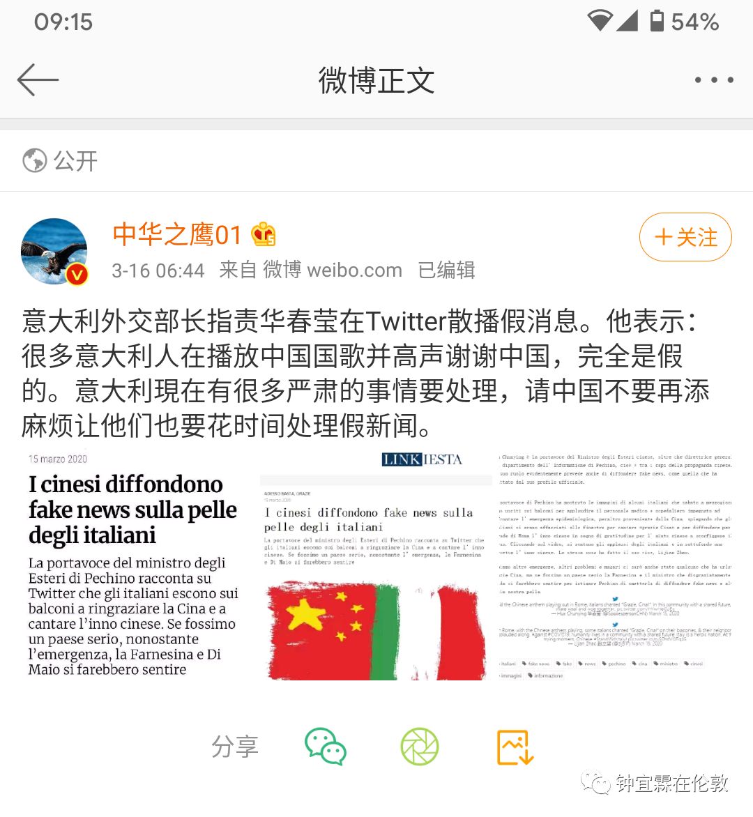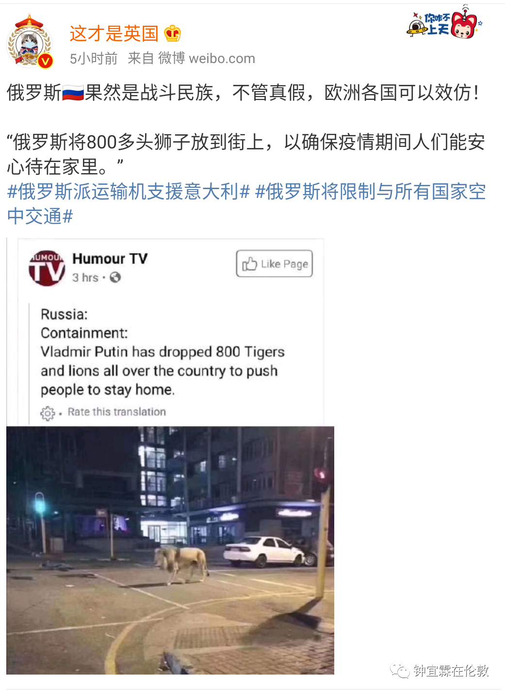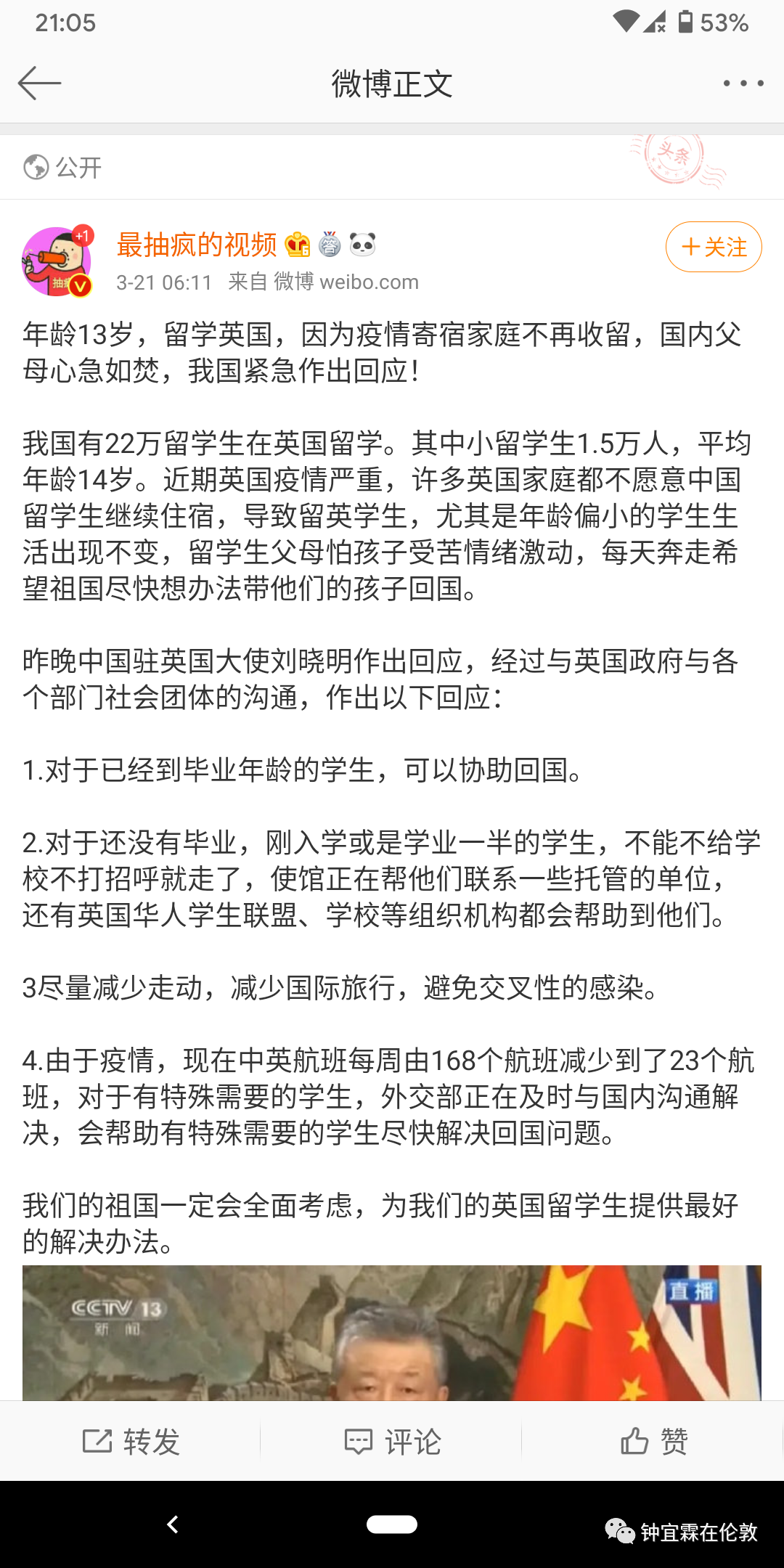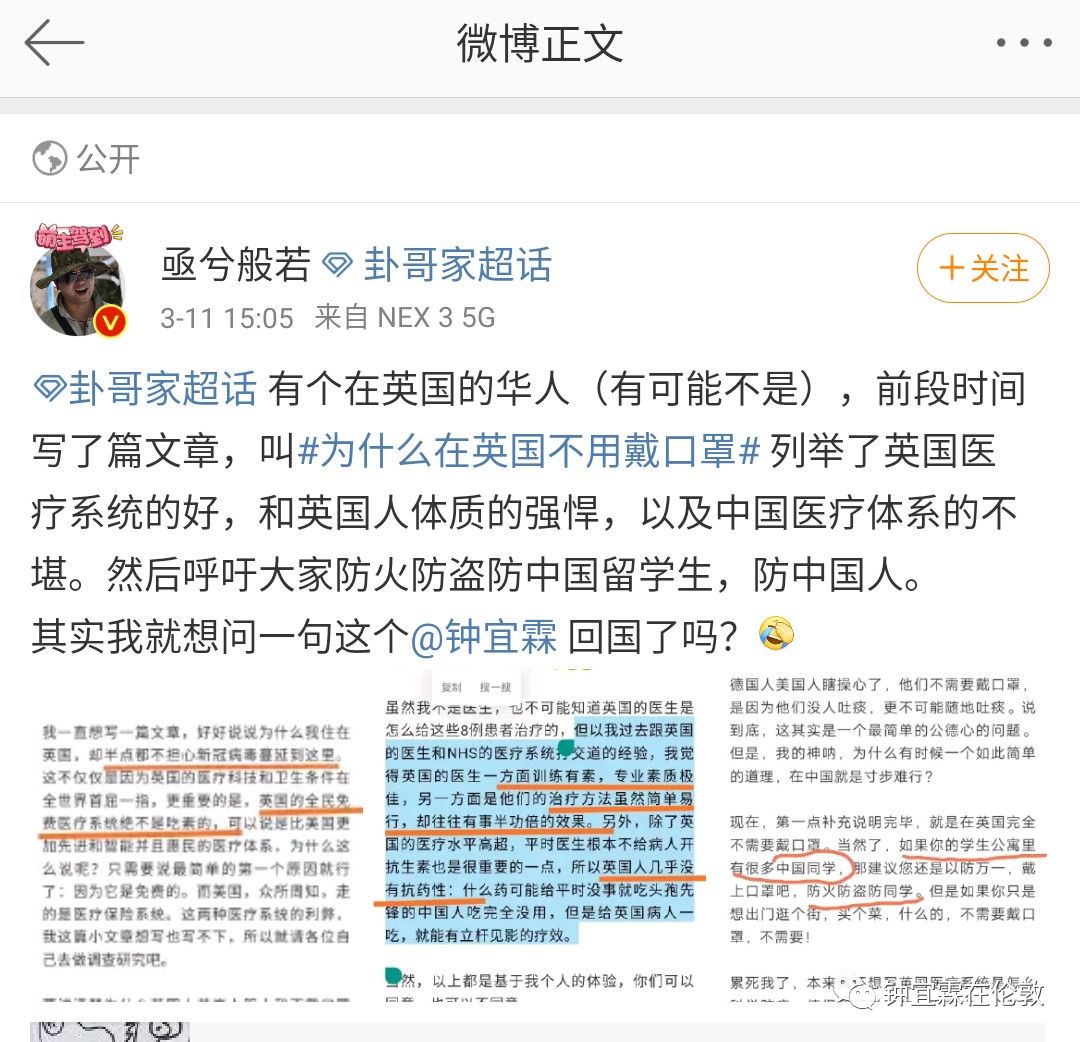 钟宜霖:我觉得国内的人都很奇怪啊,尤其是那些五毛。现在(3月15日)德国4000多例,法国4000多例,西班牙六七千例,意大利一万两千例,英国现在是最少的,才1140例,但是现在所有舆论的矛头都指向英国,你说国内的人是不是很奇怪啊?他们为什么不去骂法国意大利德国?这些国家感染的人数都比英国多呀,而且英国到现在为止都允许中国人入境,没有切断任何感染源头哦!所以英国的危险应该远远大于德国法国这些国家,但是英国现在感染的病人最少,防疫已经做得相当成功了。所以我觉得好奇怪啊,国内的人为什么都在骂英国呢?我就是百思不得其解。难道是羡慕嫉妒恨?