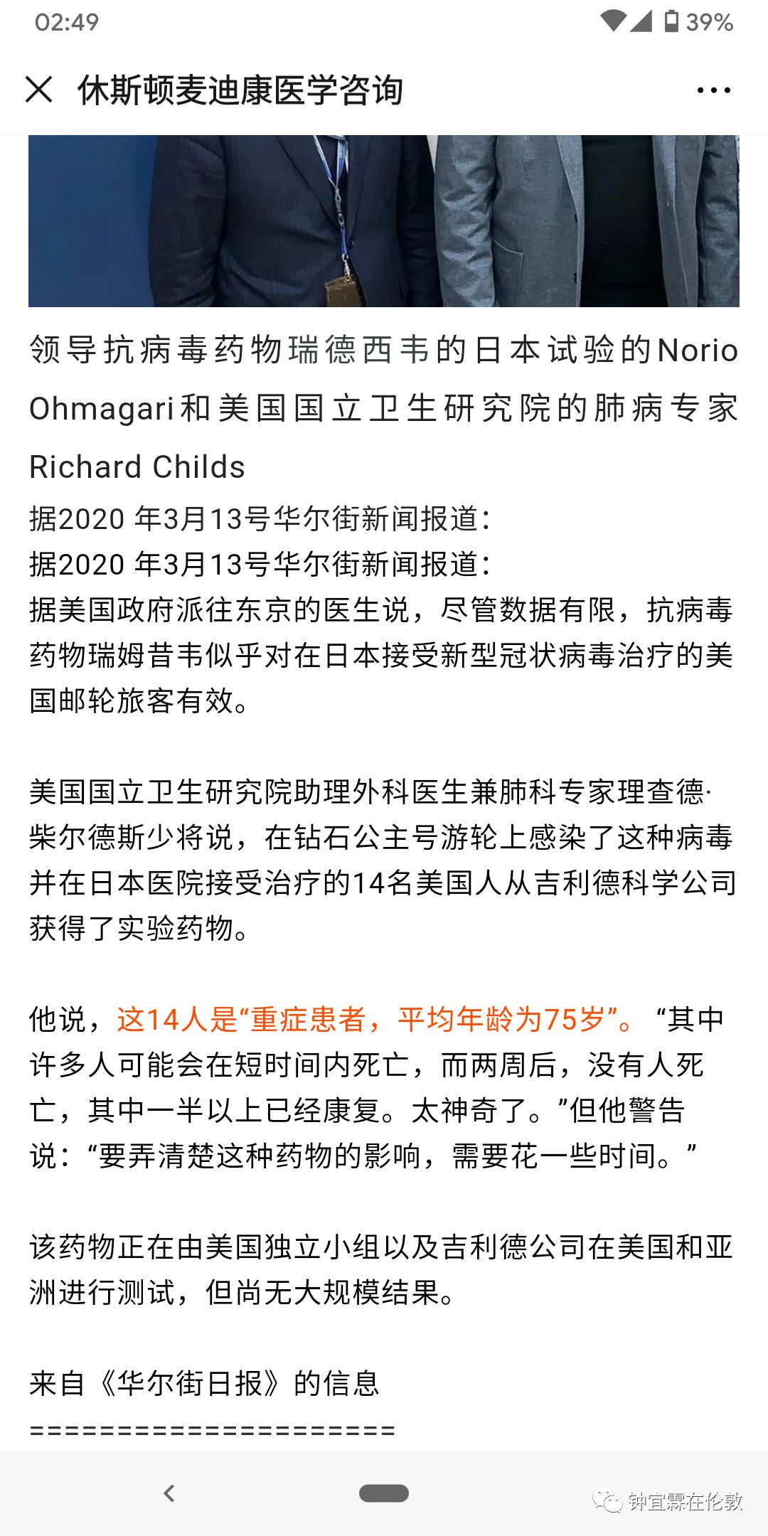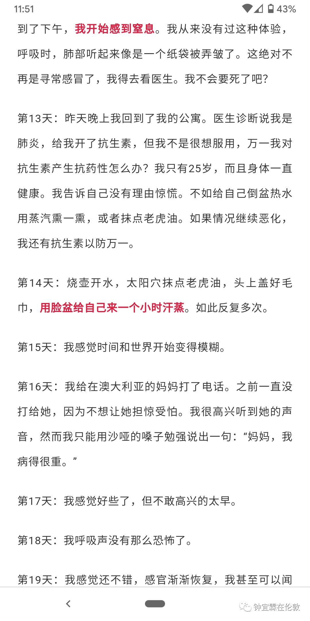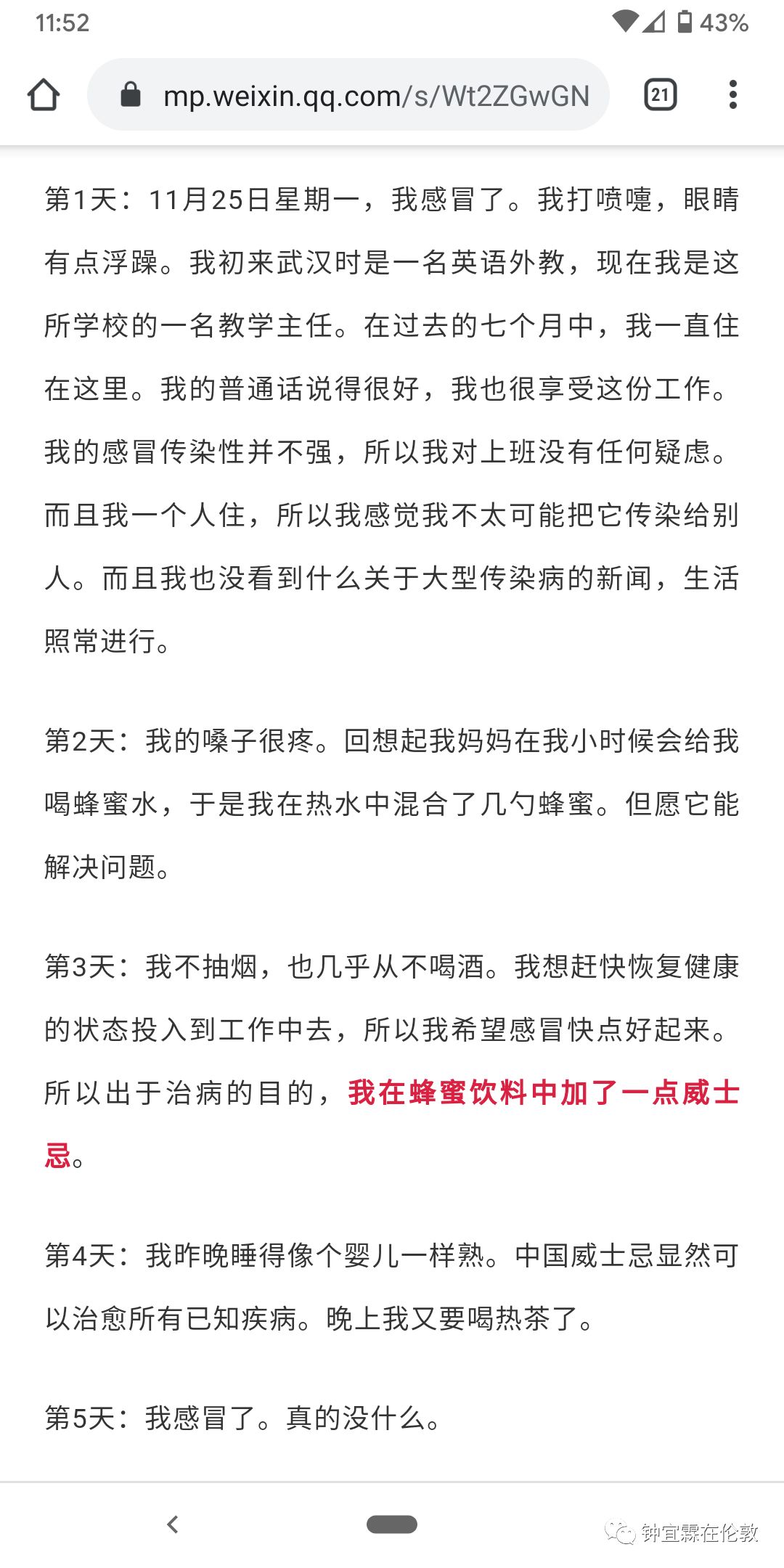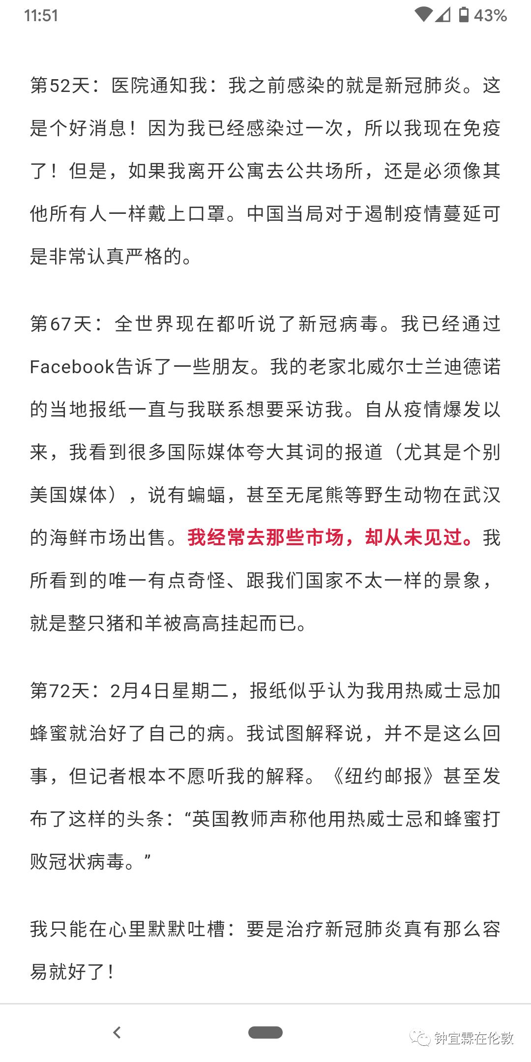 下面我要说的第二个问题,是因为我今天才看到这个一直被国内媒体“忽视”或者说没有报道的英国第一例病毒患者的故事。我捡了几个重点的部分,简单截图如下:
