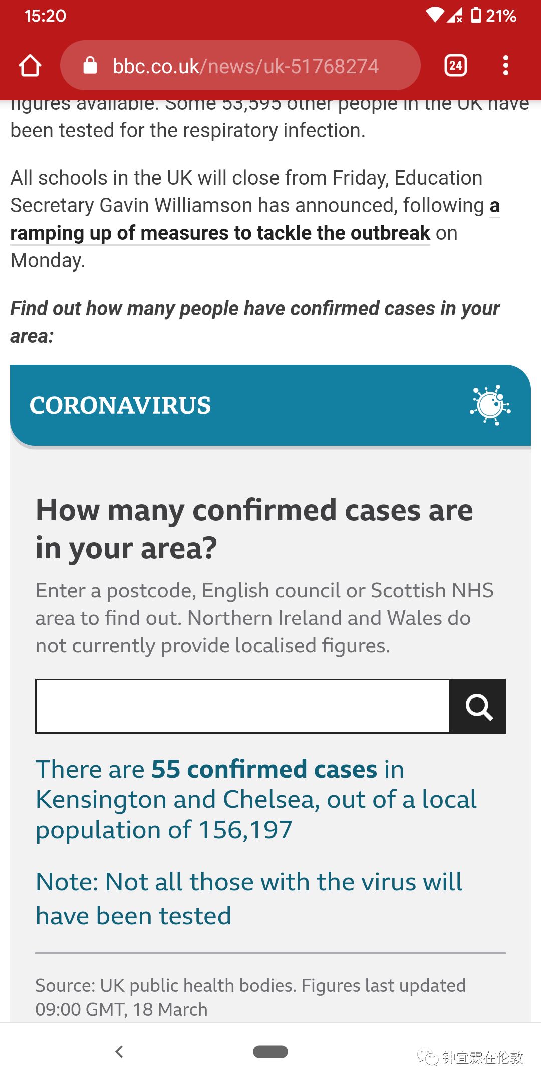 下面这张图是bbc网站提供的查询你所在小区的新冠病毒感染确诊的人数,在英国的朋友可以自己去查一下。我所在的社区一共有15.6万居民,目前现在总共有55例确诊。