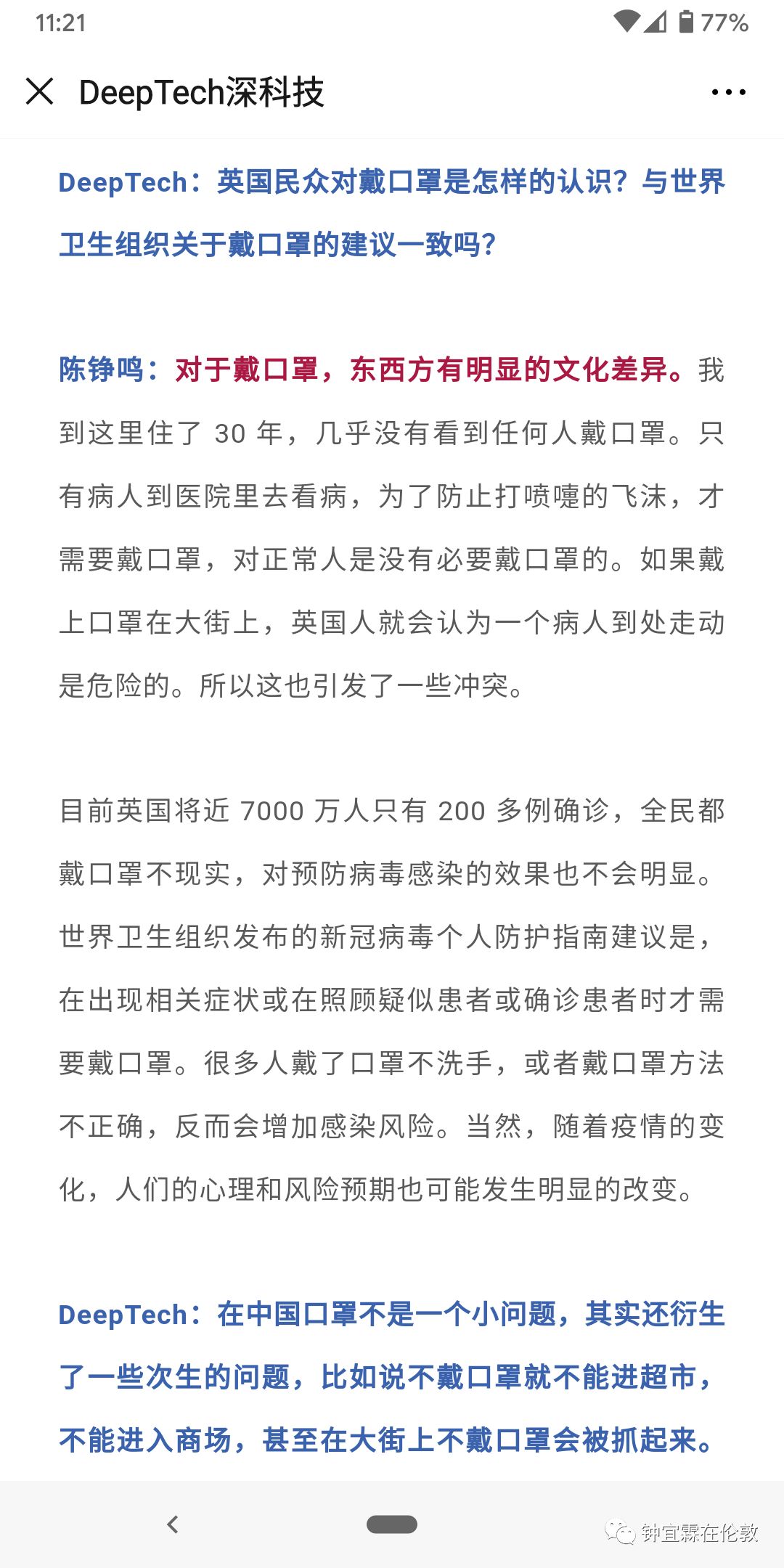 钟宜霖:没有,我知道你意思,没有这个文章,我写了干嘛给自己找事儿对吧。妹妹,这个事情要说起来就话长了,现在包括英国媒体在内,还有中国媒体,一轮番炒作的那个所谓英国的免疫社会,那是个天大的误解。我上次有一篇文章解释过这个,但是好像没有人注意到。为什么呢,就是那个科学官当时接手这个天空电视台的采访,他谈了整整九分钟。这个免疫社会,只是其中的一句话。但是这一句话就被这个电视台,为了增加它的收视率断章取义地取出来,做成了标题。就搞得轩然大波,不只是英国民众轩然大波,这个中国人也是觉得啊,怎么可能这样要牺牲60%的人来造成免疫社会,保护老弱病残。这其实是个天大的误会。