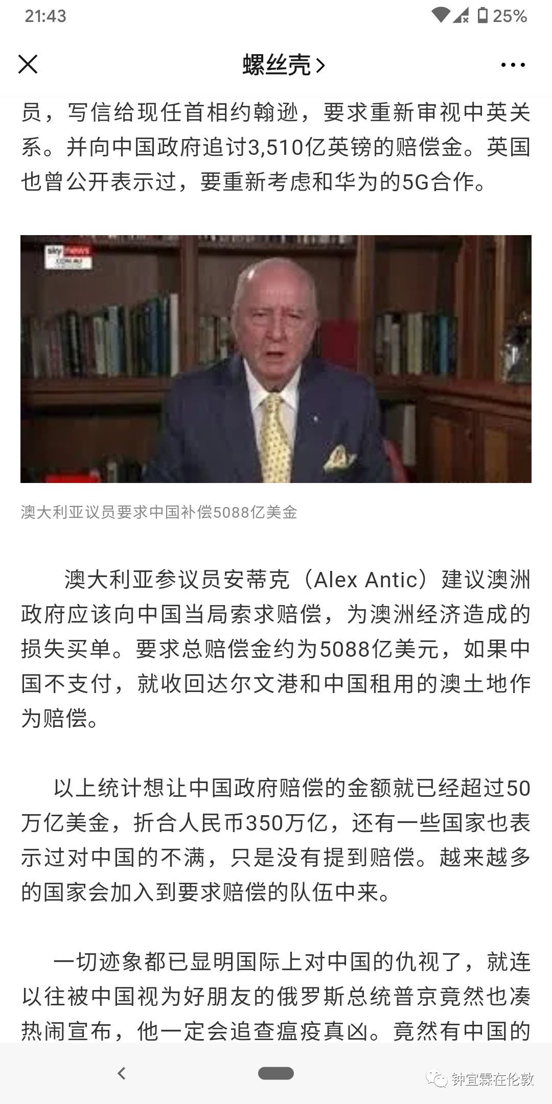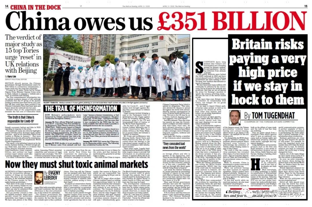 昨天有15名英国议员向英国议会提议,要求中国支付英国防疫以来的各种经济支出(如医疗医药等)351亿英镑。这是继几天前美国有议员在接受福布斯电视采访时,要求中国赔偿美国疫情期间的经济损失以后的第二条相关新闻。