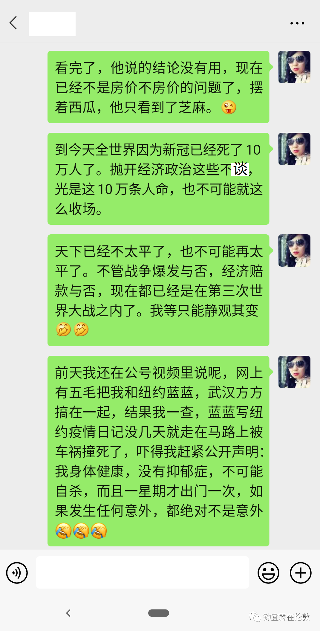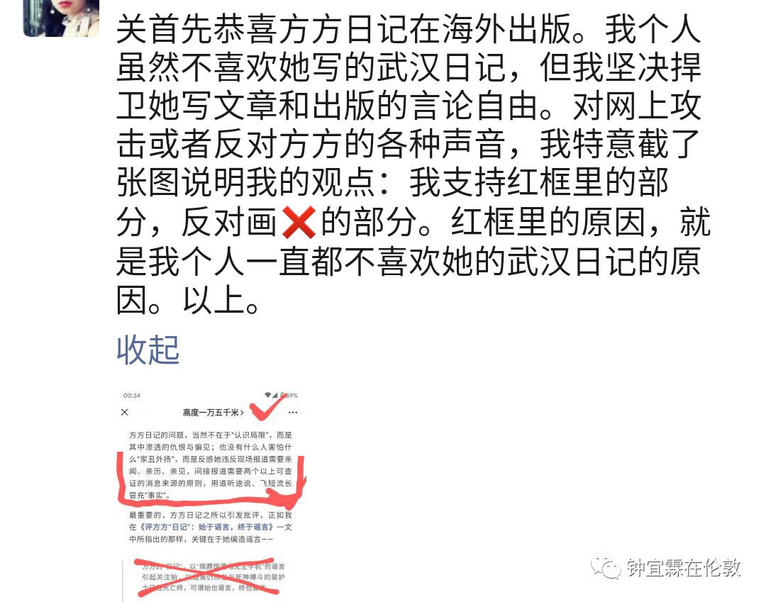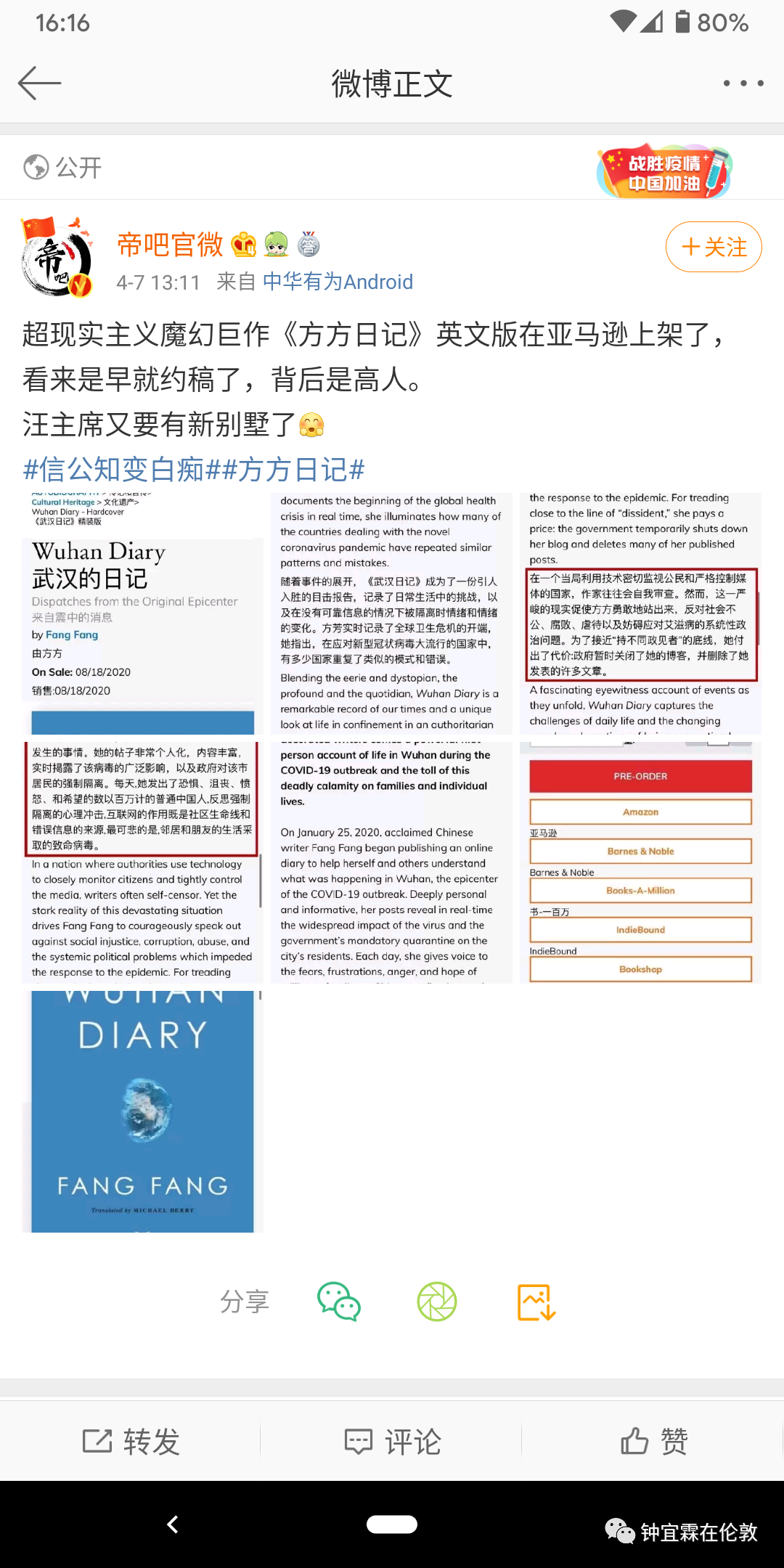 有趣的是,在她后来陆续发布的日记里,不知道是为了迎合读者还是观众,她突然又变身成为了一个不同政见者,这种摇身一变实在让人觉得匪夷所思,对此我无可评论,只能“呵呵”了。我们经常说文如其人,但方方的这种政治立场上的见风使舵颇是有趣,也算是国内某些作家的风景线吧。与我无关,不再评述。想看我以前对她的评价请看我两个月前写的《谈作家》(在本公号里还有),但我重申,虽然我个人不喜欢她写的武汉日记,但我支持并且坚决捍卫她写作和出版的自由和权利。这完全是两码事,ok?