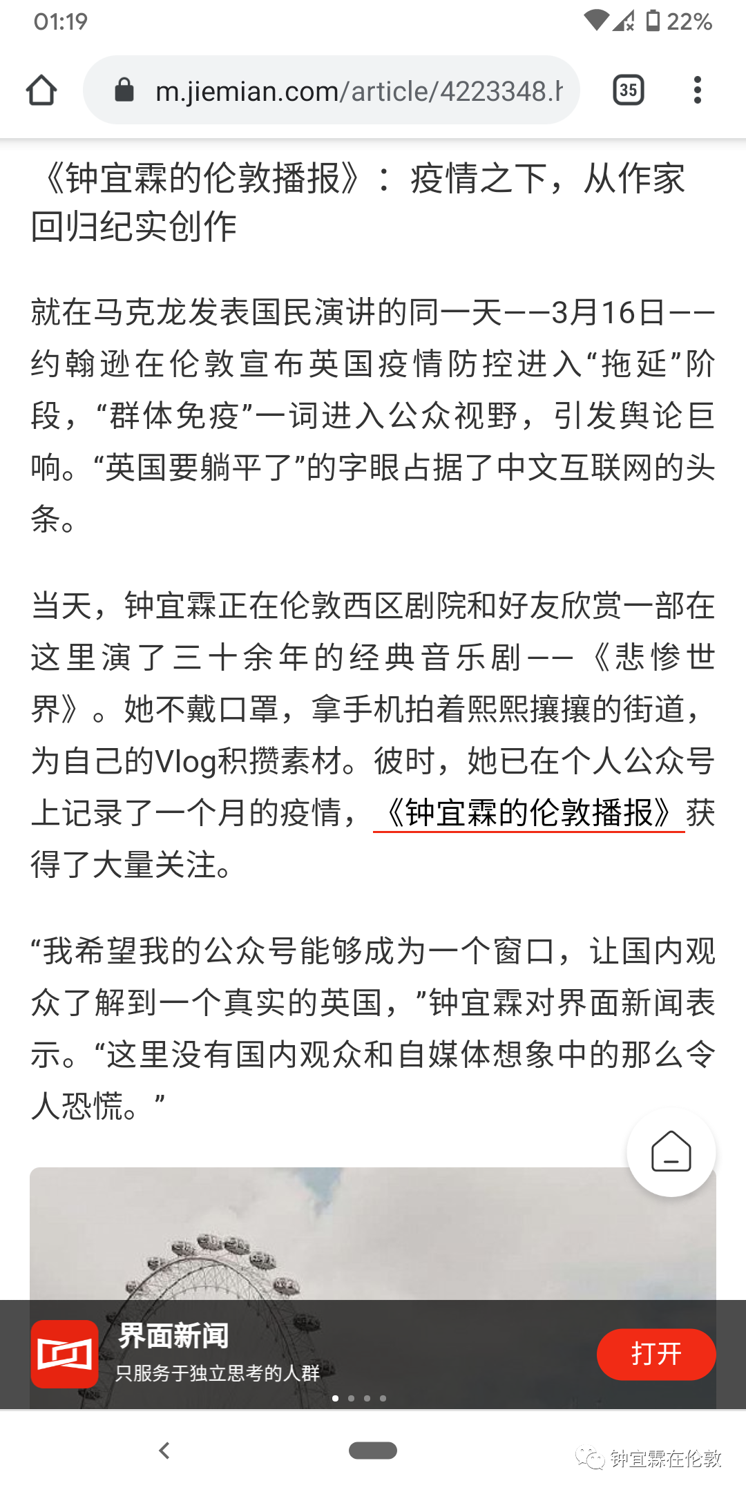 更完鲍里斯首相的康复消息,下面再更新一下我自己的忽然一周。首先要谢谢界面新闻的采访,让我这个远天远地住在海外的作家也上了一回国内的官方新闻。