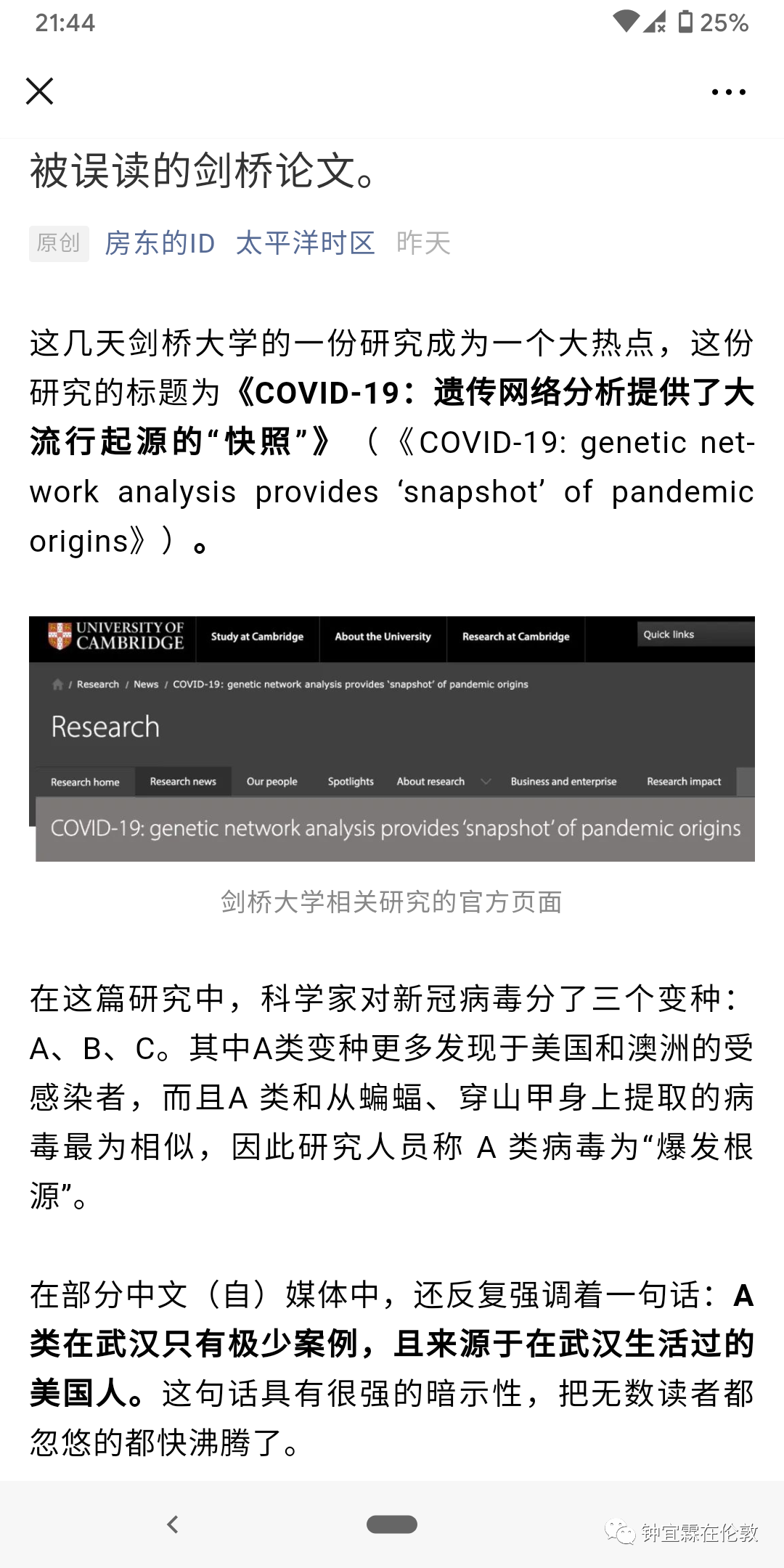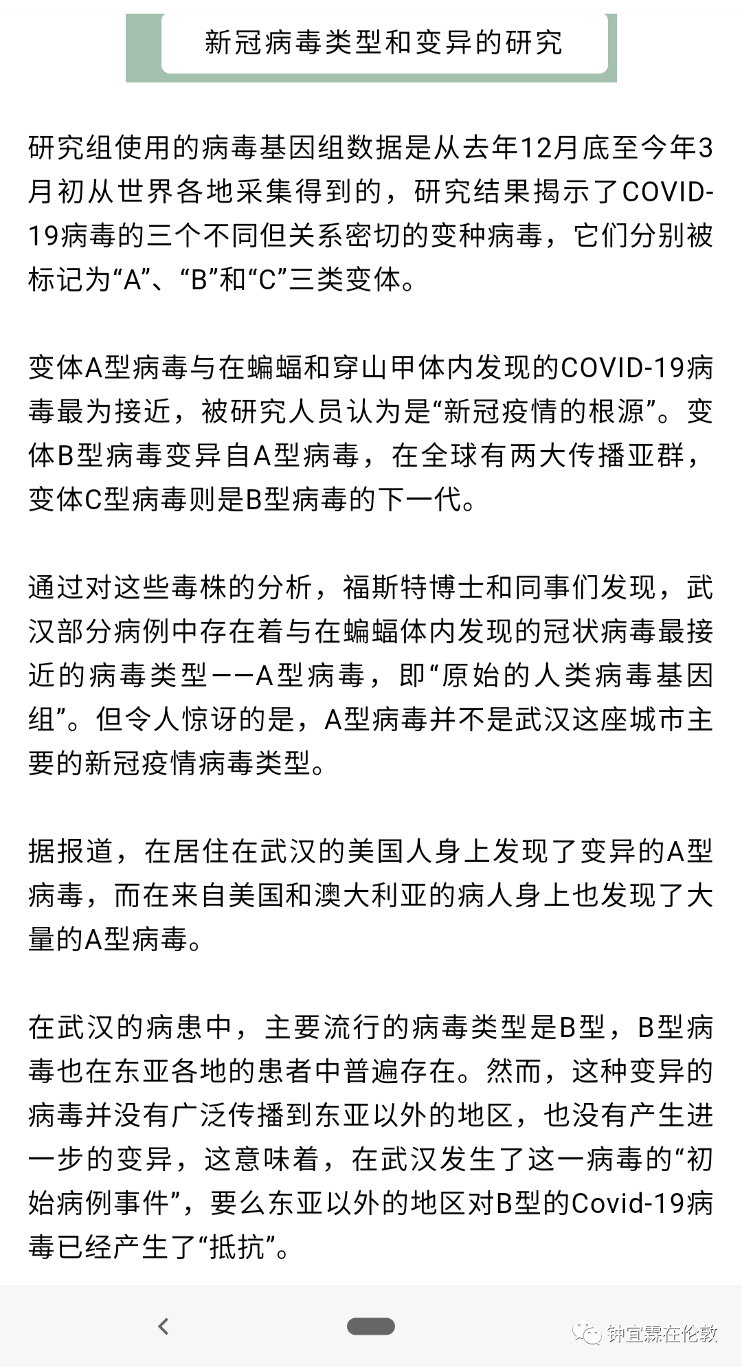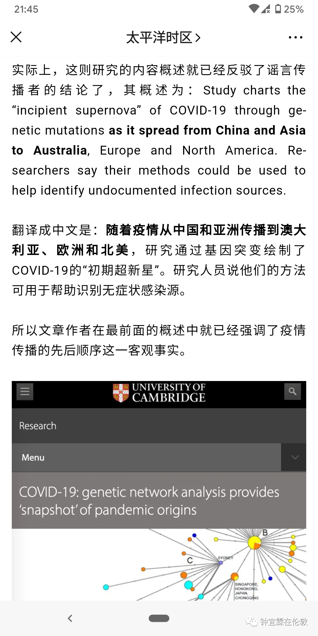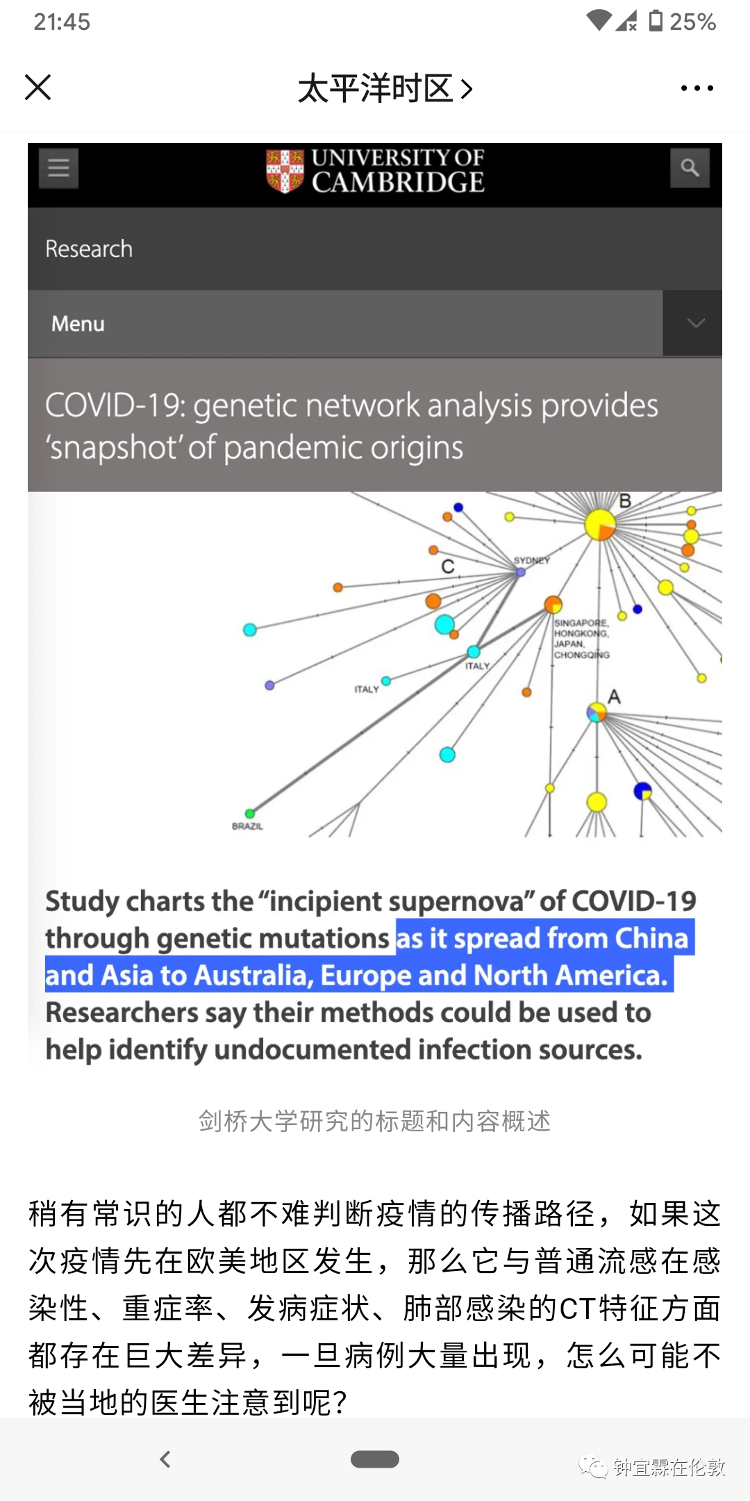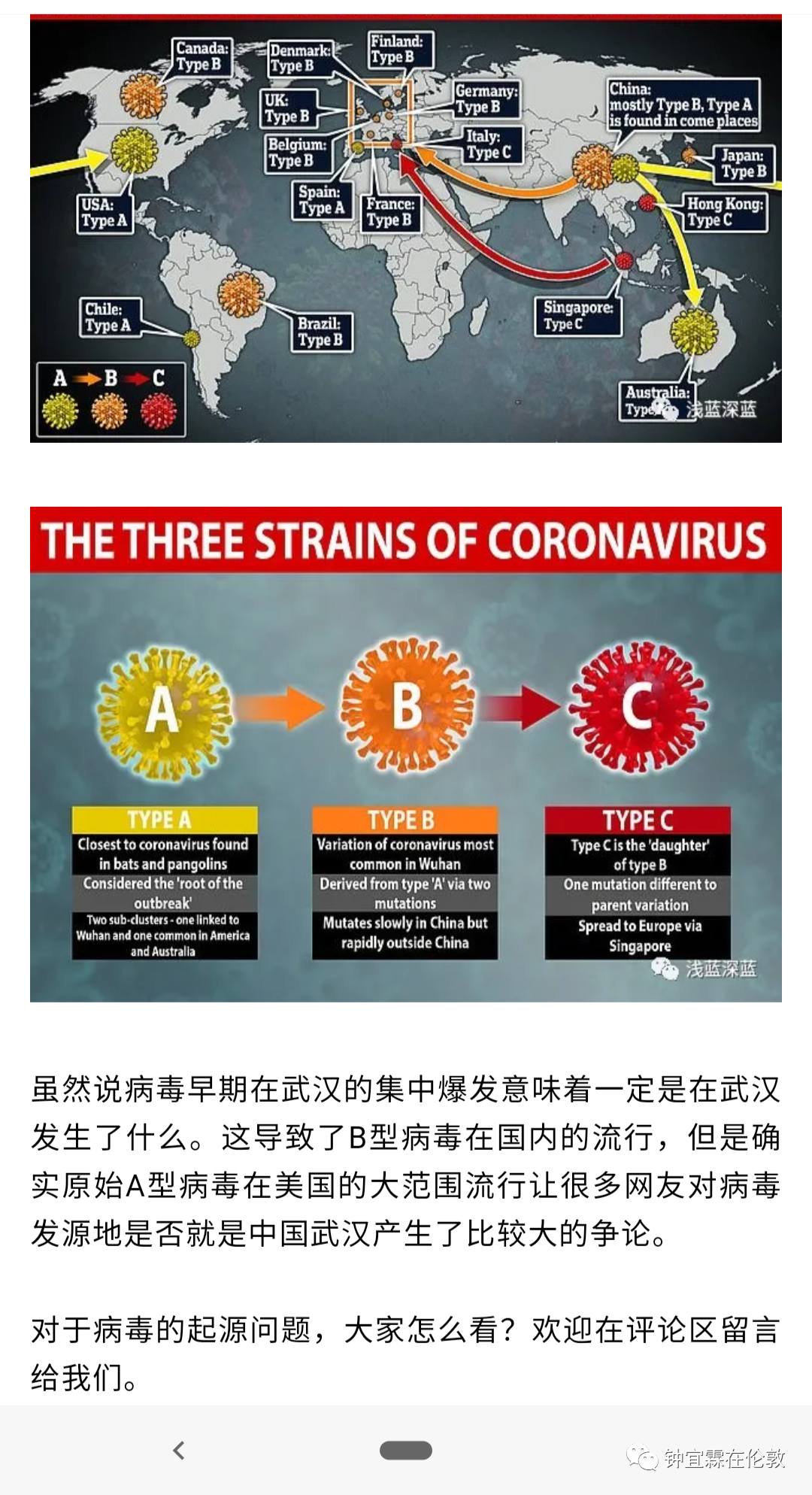 首先是这篇标题为《新冠病毒到底源于何地?剑桥大学最新报告溯源!》的文章,说来说去就是为了暗示或者强调一个观点,就是最早的A型病毒起源于美国人,而且这种病毒也是现在在美国和澳大利亚流行的病毒类型。所以——该自媒体文章作者的言外之意,已经不言自明了吧?