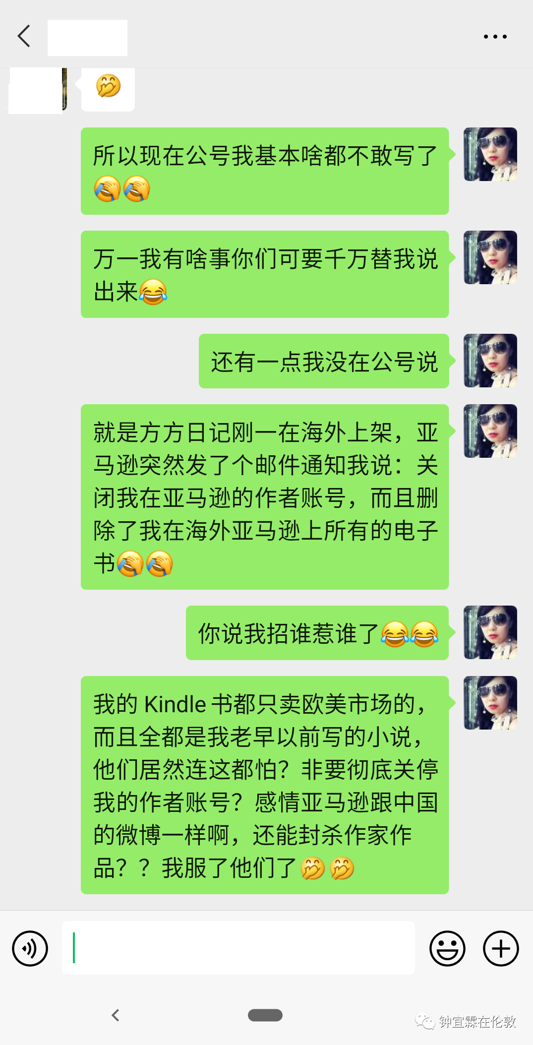 所以你们说我这到底是不是比窦娥还冤?方方出版《武汉日记》,跟我这个远天远地住在英国的作家有半毛钱的关系啊?你们亚马逊是发了神经病还是被哪个大国威胁了?居然莫名其妙地关闭了我好几年都没用更新过作品的作者账号,而且还删除了我几年前就已经发表上架的全部电子书??这到底是什么神操作? 如果我的读者和粉丝里有律师朋友愿意帮忙的,请在后台给我发留言联系。我也真是醉了。。